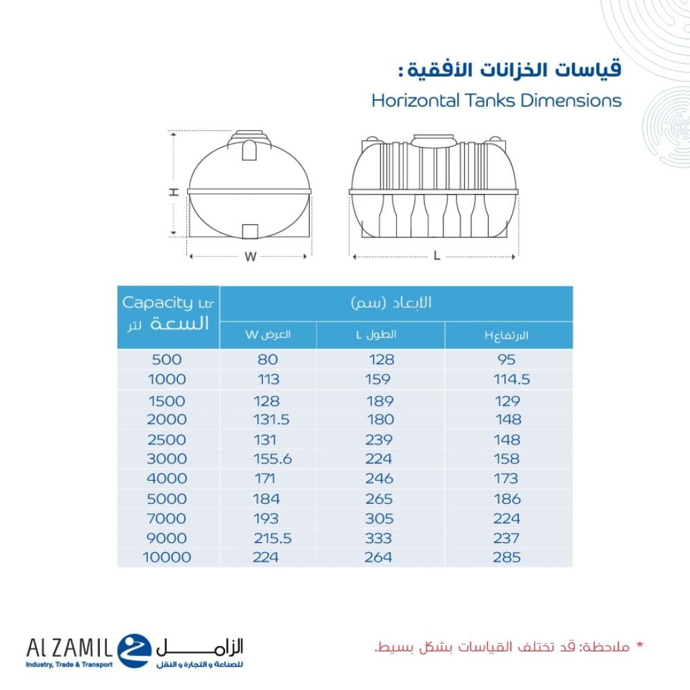 إليك أبرز الأحجام والأسعار الخاصة بـ خزان مياه الزامل 4 طبقات أفقي: